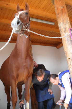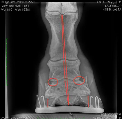 A cél az volt, hogy mellső lábai egyensúlyba kerüljenek. Bal első lába különösen problémás volt az eltolódott mediolaterális egyensúly miatt. A ló lábairól a régi patkókkal, a patkók eltávolítása és a körmölés után, majd az új patkókkal is röntgenfelvételek készültek. Kiváló alkalom volt ez arra, hogy megtapasztaljuk, mennyiben megkönnyíti a kovács és az állatorvos munkáját néhány jó minőségű röntgenfelvétel. Az már csak a hab a tortán, hogy dr. Kis János jóvoltából az ország egyik legmodernebb, érintőképernyős direkt digitális mobil röntgenkészülékét láthattuk munka közben.