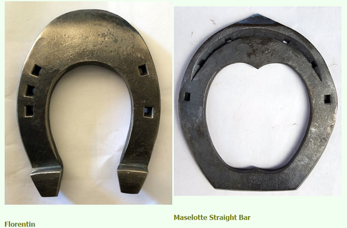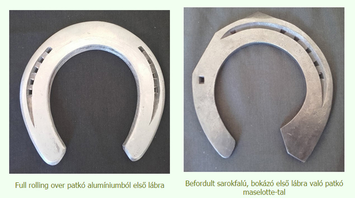 Befordult sarokfalú, bokázó első lábra való patkó maselotte-tal