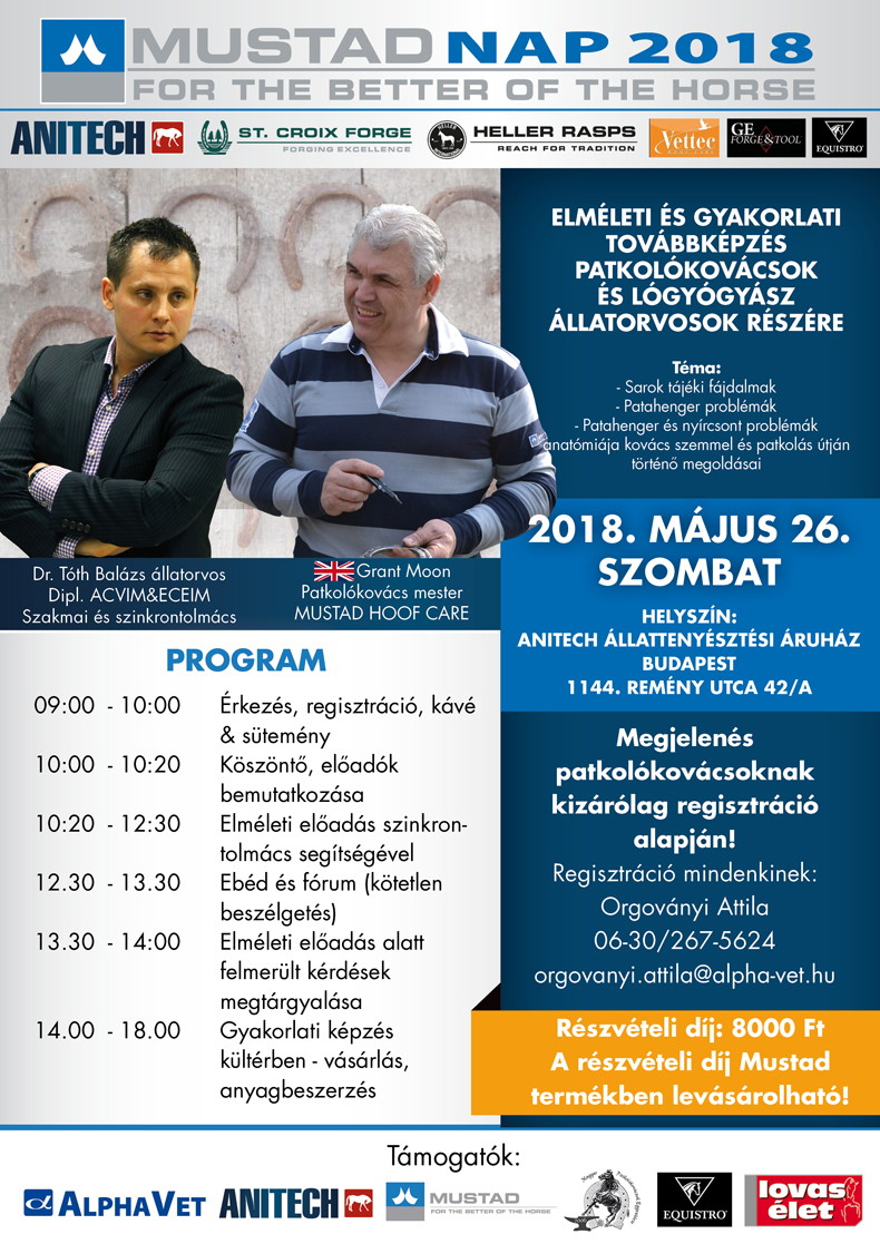 Grant Moon májusban ismét Magyarországra látogat, hogy képzést tartson patkolókovácsok és lógyógyász állatorvosok részére. A témák: a saroktájéki fájdalmak, a patahenger és a nyírcsont problémái és kezelési lehetőségei patkolás útján.