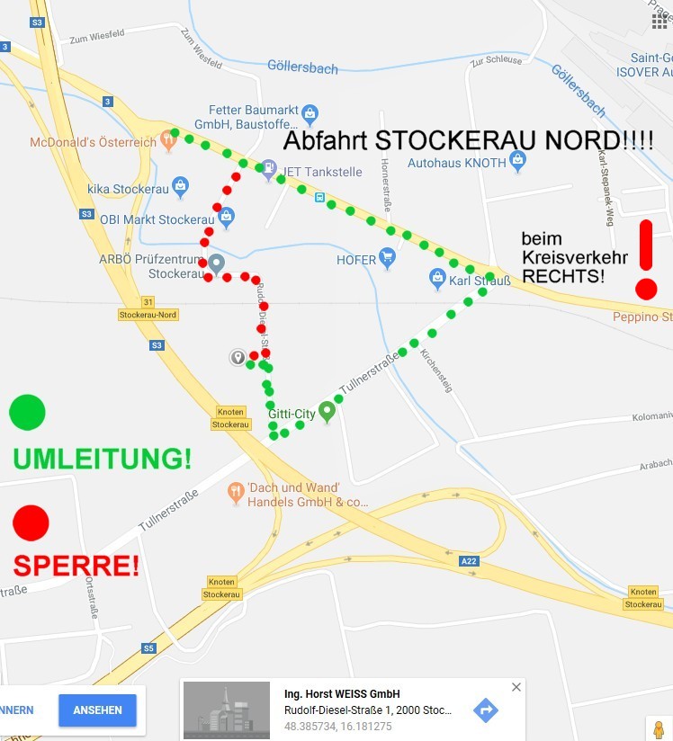 A pirossal jelölt útvonal le van zárva, a Horst Weiss GmbH telephelye a zölddel jelölt útvonalon közelíthető meg.