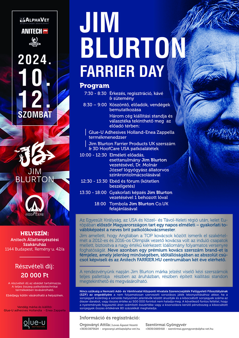 Az Egyesült Királyság, az USA, a Közel- és Távol-keleti régió után, Kelet-Európában először Magyarországon tart egynapos elméleti és gyakorlati továbbképzést a neves brit patkolókovács mester, Jim Blurton. Amellett, hogy Angliában a top kovácsok között ismerik el szakértemét, a 2012-es és 2016-os olimpiák vezető kovácsa volt.